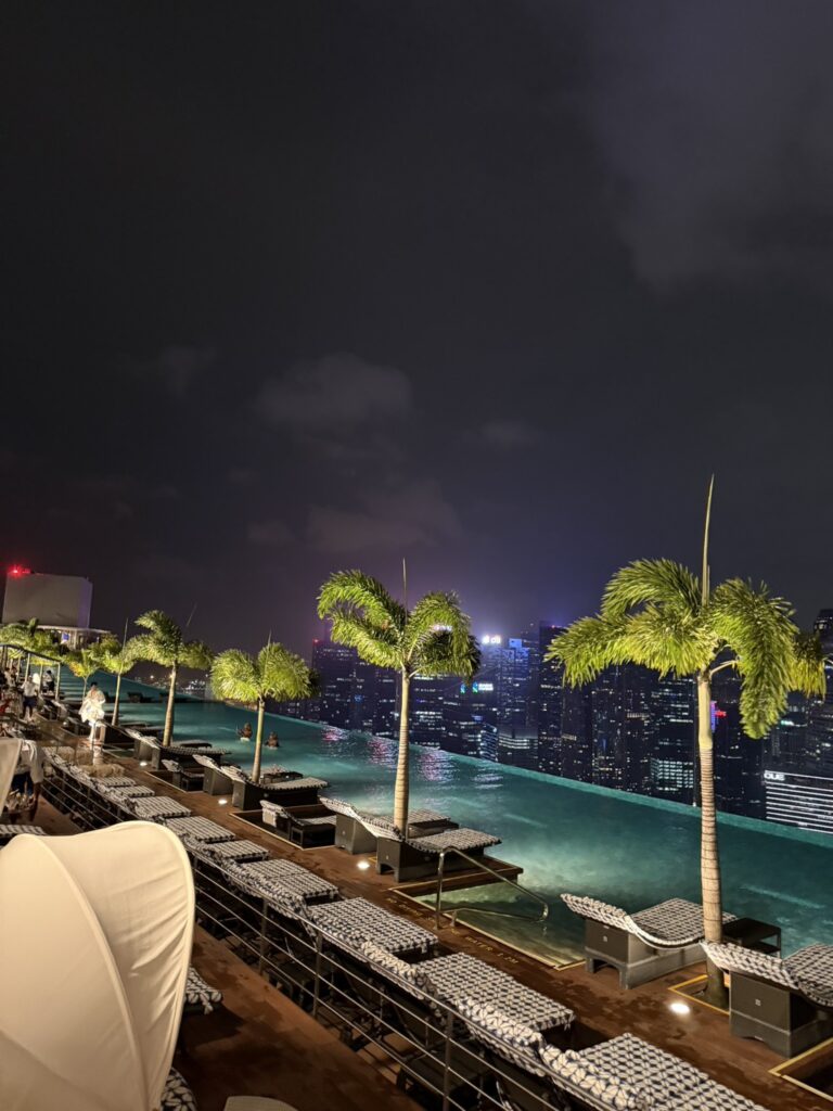 お次に紹介するのは「インフィニティプール」です。死ぬまでにここで泳いでみたいと思っていましたが、なんと20代のうちに叶えることができました。このプールは宿泊者は全員利用することができます。プールに入る前にカードキーをスキャンする必要があるので、宿泊者以外は入ることができないようになっています。